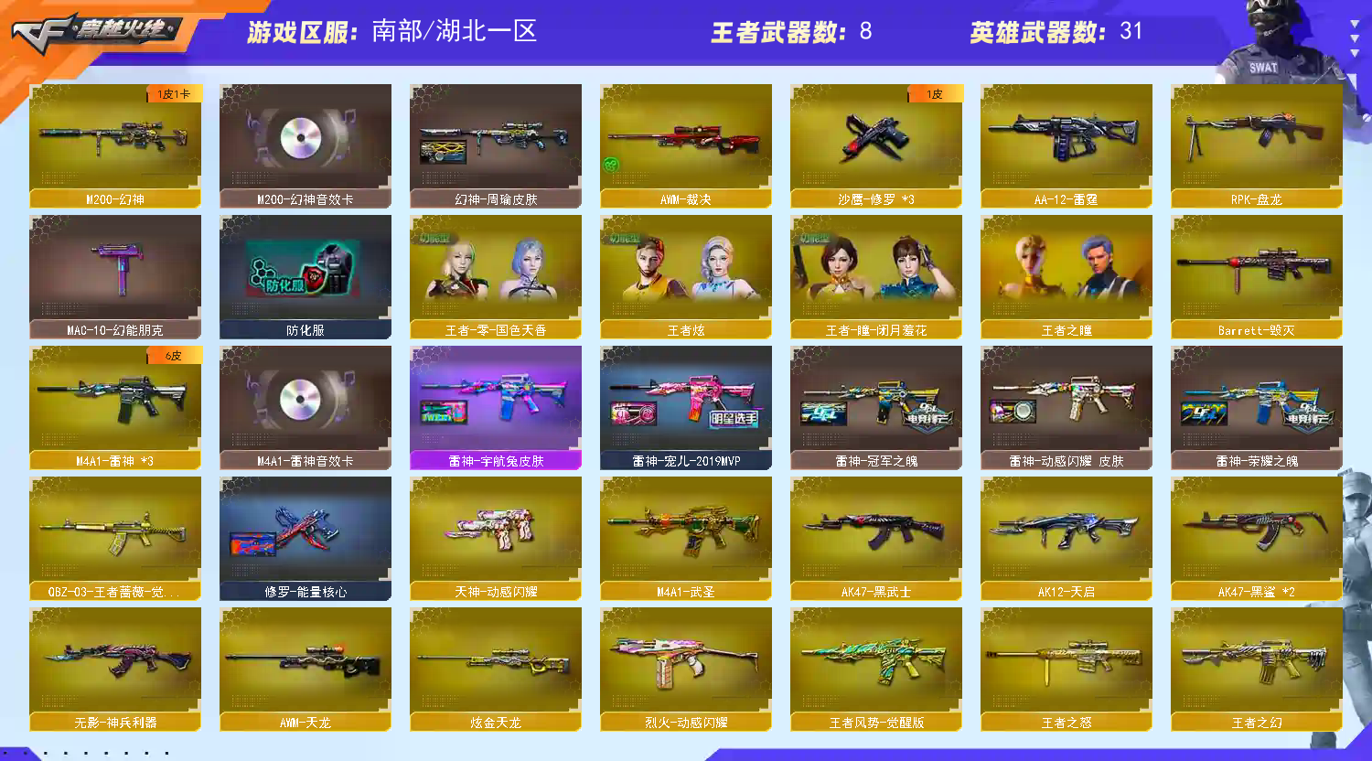 【M200-幻神+音效卡+幻神-动感闪耀+幻神-周瑜】【QBZ-03-王者普薇】【裁决】【Barrett-毁灭】【M4A1-雷神+音效卡+雷神-宠儿+雷神-荣耀之魄】【王者风势】【黑武士 天启】【4手枪 修罗*3 】【10近战 屠龙*4 龙啸*2 擎天 麒麟刺*2】【四防 王者零国色天香 王者炫】【幻神音效卡 M4A1-雷神音效卡】