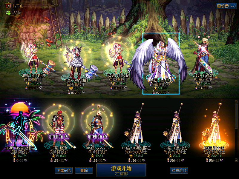 共十七个角色,四个角色可单手115级未央搬砖,穿神圣光翼天使套,自动拾取道具