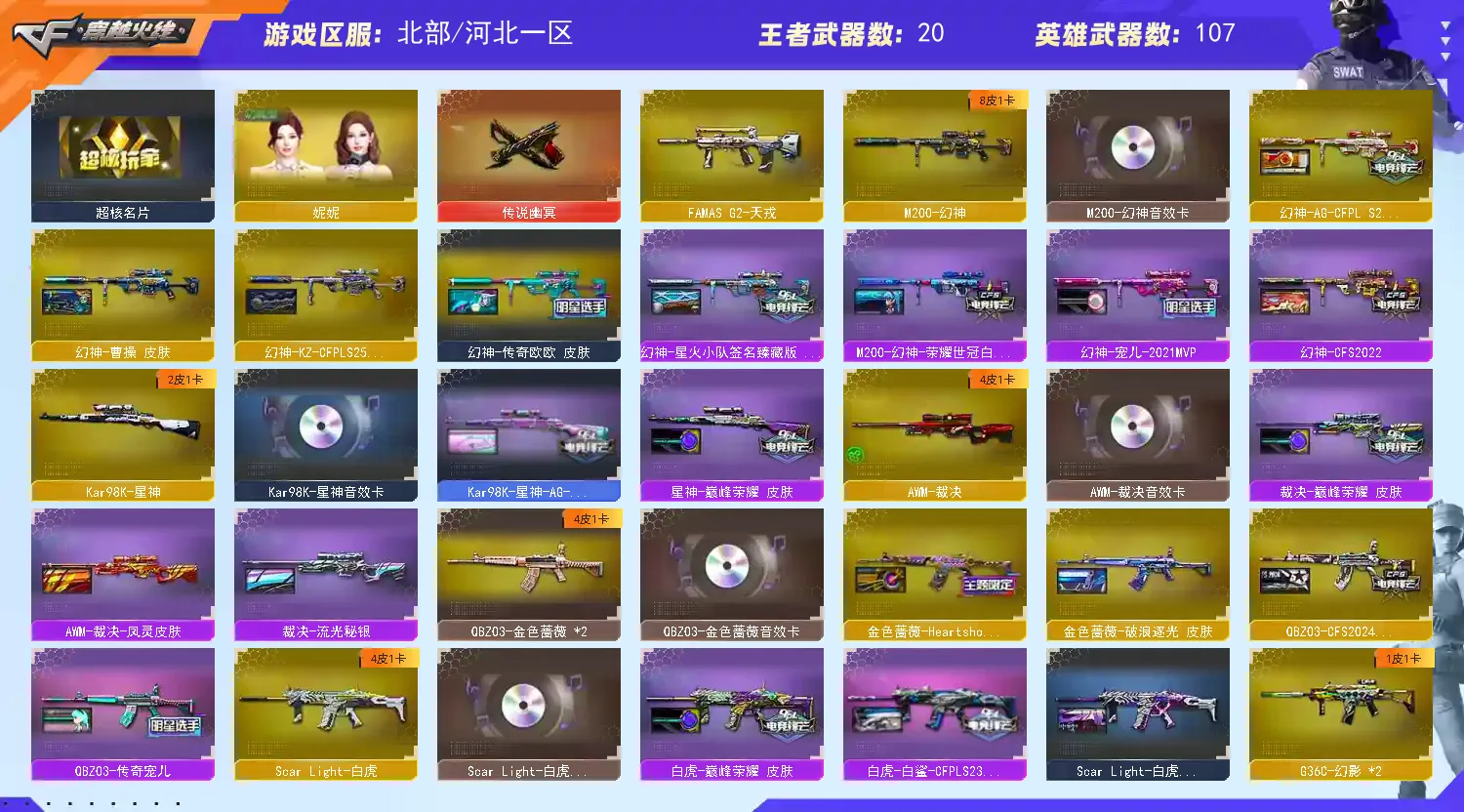 幻神皮肤:宠儿皮肤 欧欧皮肤 星火小队 白鲨世冠 新AG皮肤 曹操皮肤 2022 kz皮肤 星神皮肤:AG. 巅峰荣耀 白虎皮肤:白鲨 巅峰荣耀 暗星 金色蔷薇皮肤: 宠儿 2024 破浪珠光 哈拉少 裁决皮肤 :巅峰荣耀 流光秘银 满配副武器 两把冠特 白鲨柯尔特 无冕之王 荣耀世冠 竞技荣光柯尔特三把 cop一把 usp雷暴 usp冥王