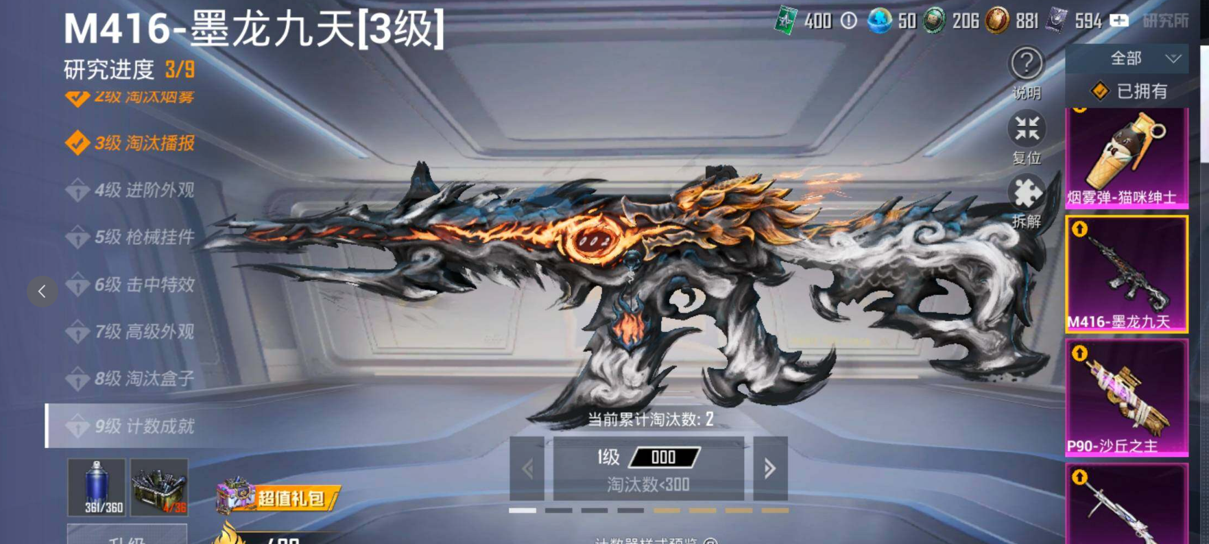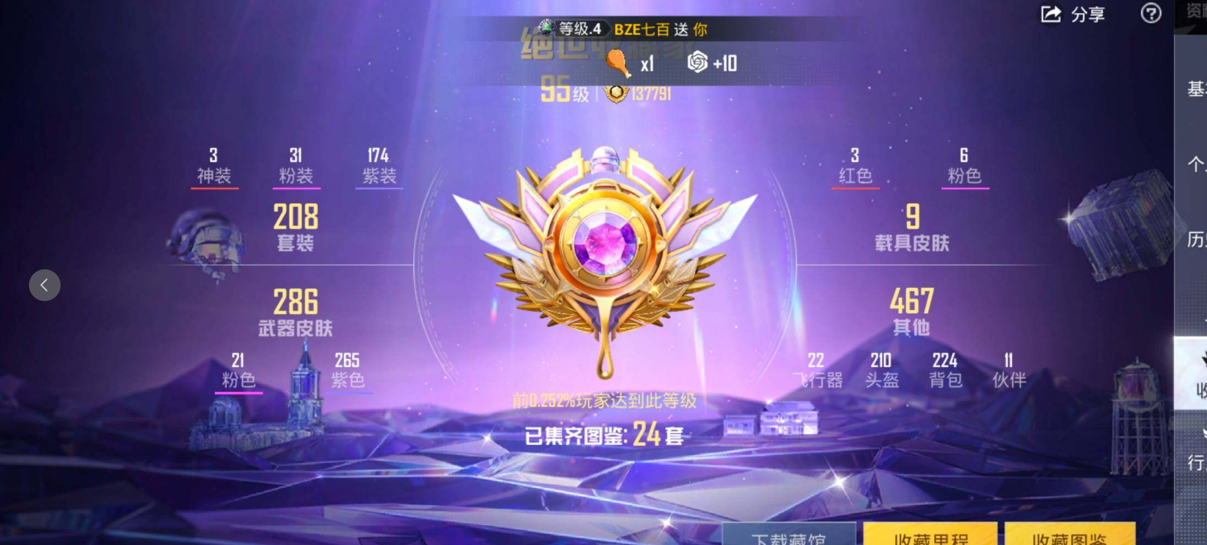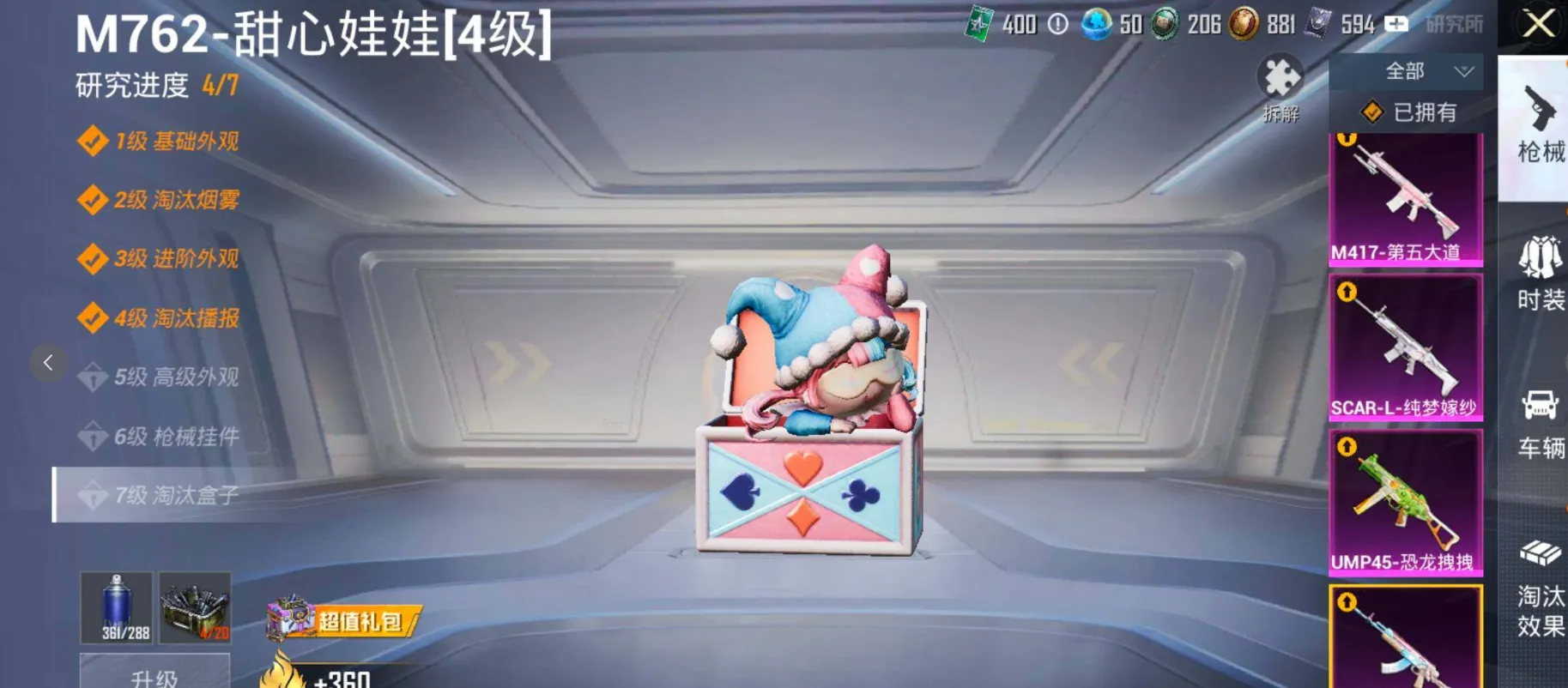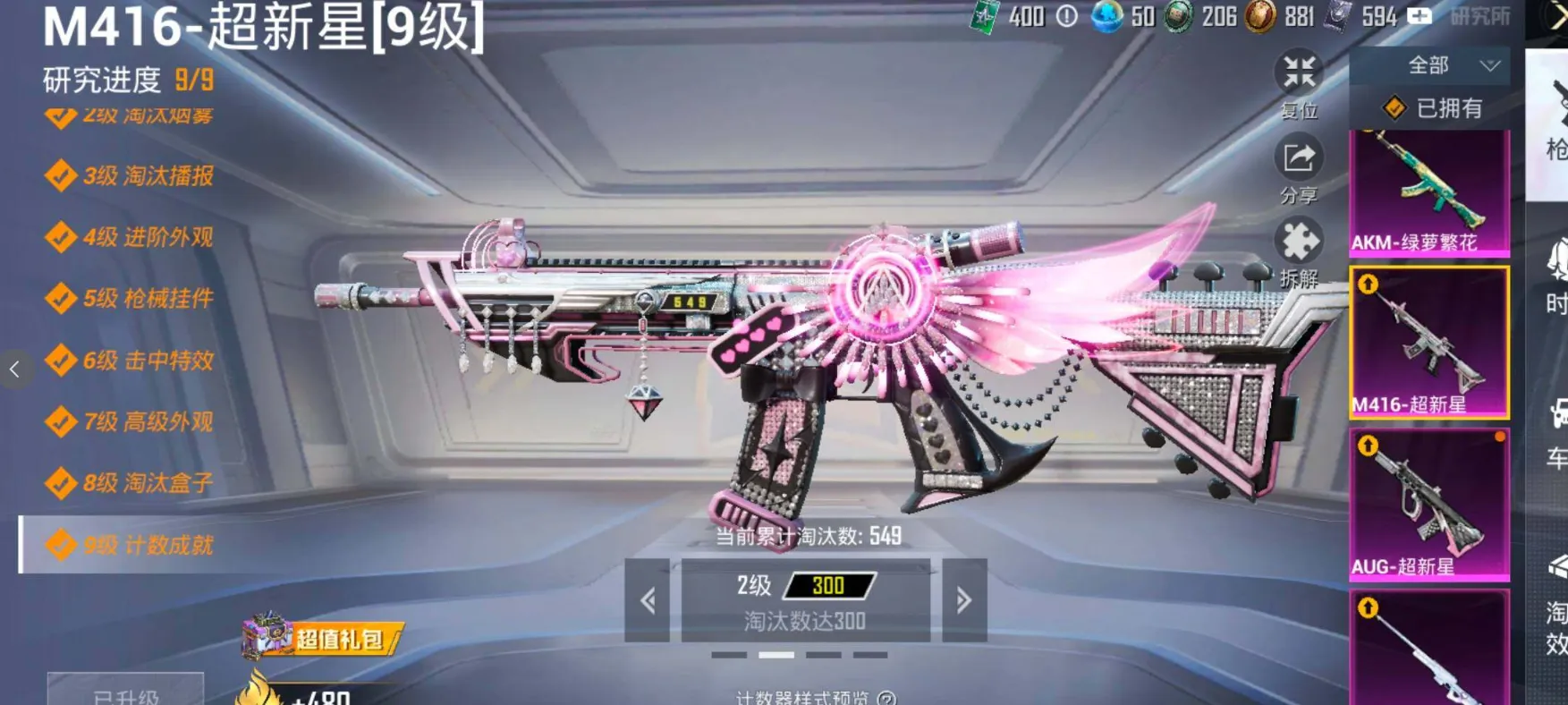【21特效枪】 M416-全功率超战 (1级) SCAR-L-纯梦嫁纱 (5级) M416-墨龙九天 (3级) M416-超新星 (9级) P90-金丰海韵 (1级) P90-沙丘之主 (6级) AKM-幽焰骑士 (3级) AKM-绿萝繁花 (5级) Kar98K-巳巳如意 (5级) DP-28-豹影疾电 (5级) AWM-璀璨巨星 (5级) AUG-星梦奇缘 (8级) AUG-超新星 (1级) M762-甜心娃娃 (4级) GROZA-精灵之光 (3级) DP-28-圣堂之誓 (5级) M417-第五大道 (4级) UMP45-恐龙拽拽 (7级) 破片手榴弹-秋玉花灯 (7级) 烟雾弹-猫咪绅士 (5级) 烟雾弹-丁香清露 (4级)