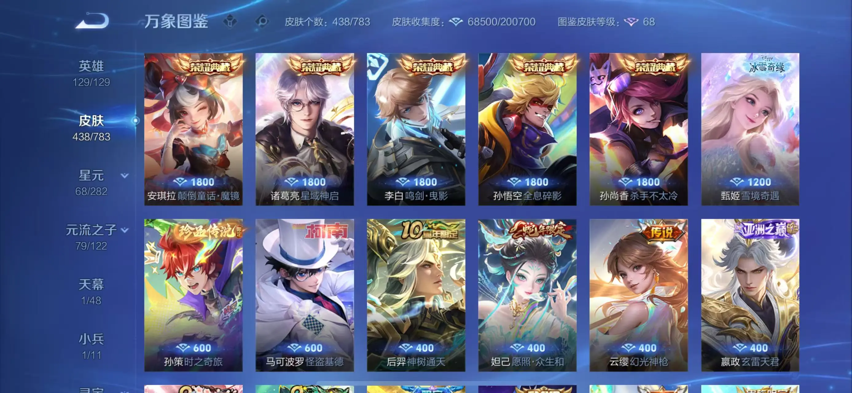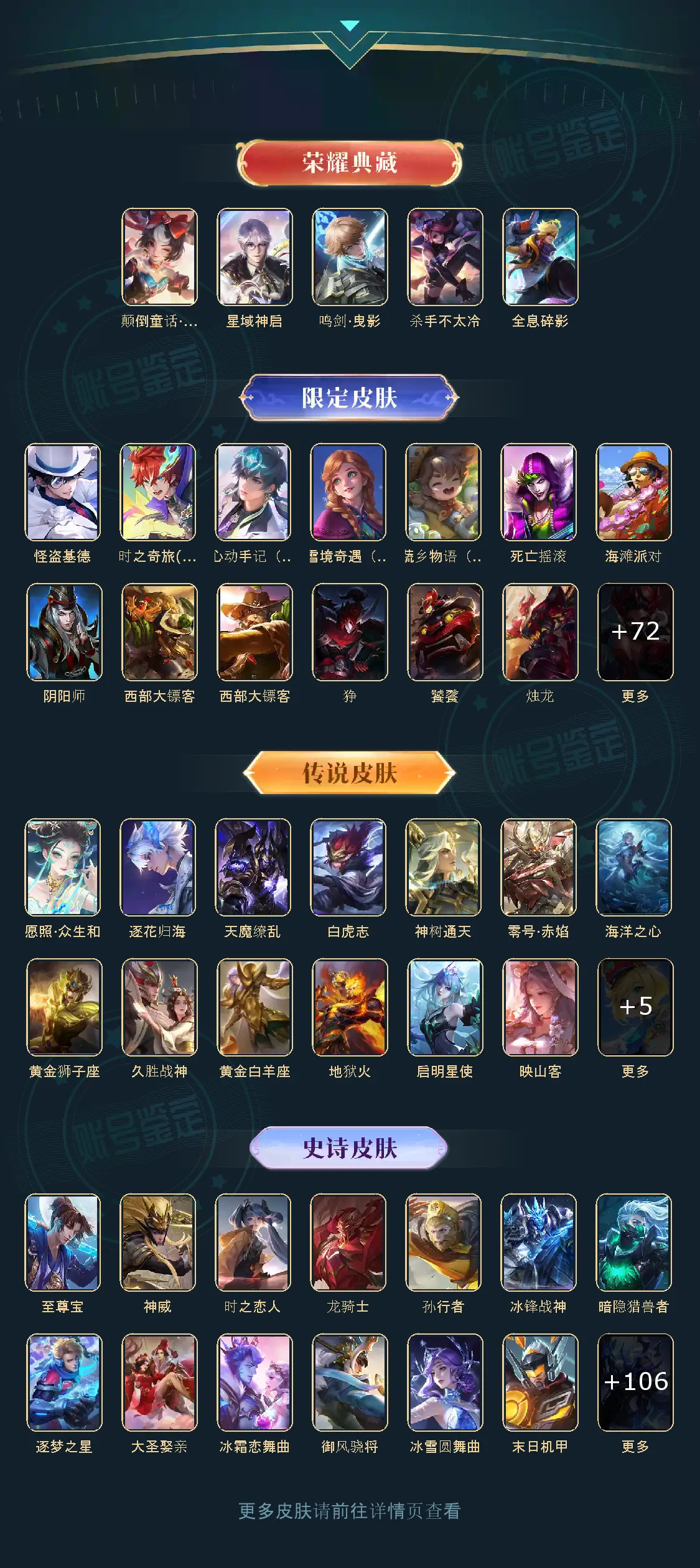 438皮5典藏18传说1无双2珍品传说V9 【珍品传说皮肤】:时之奇旅,怪盗基德【无双皮肤】:雪境奇遇【荣耀典藏】:颠倒童话·魔镜,星域神启,鸣剑·曳影,杀手不太冷,全息碎影【优质限定皮肤】:神威,白虎志,至尊宝,天魔缭乱【传说皮肤】:黄金白羊座,小动物乐团,金乌负日,神树通天,久胜战神,幻光神枪,愿照·众生和,玄雷天君,映山客,鸣野蒿,逐花归海,启明星使,零号·赤焰,白虎志,海洋之心,天魔缭乱,黄金狮子座,地狱火【史诗皮肤】:心动手记,时之奇旅,百里守约真我赫兹,线条小狗,九幽镇关,胡桃异想国,光弋星穹,罗小黑战记,万物之道,百相守梦,石田雨龙,乐园奇幻夜,暗夜猫娘,灵蛊蚀心,龙之律动,鸭鸭历险记,化蝶舞,晚萤,器灵·浮梦炉,茶境仙,荣光圣徽,星界战将,月团寄思,天秀·启明,诗语江南,超时空战士,百相守梦,游园惊梦,陌上桑,紫霞仙子,电玩高手,千年之狐,谪仙醉月,破空之剑,战舞者,驯魔猎人,顽岩魄,夏日便利店,妄想食味,黄金分割率,心灵战警,怒海争锋,青焰无极,孙行者,时之恋人,猫狗日记,真爱魔法,黎明之约,蔬乡物语,鬼剑武藏,德古拉伯爵,青蛇,魅语,绅士熊喵,燃音魔法,琥珀纪元,无限星赏官,雪夜绮愿,地狱燃心,幽灵船长,原初追逐者,冰冠公主,特工魅影,百解令,天才门将,节奏热浪,江河有灵,无心,五谷丰年,苍穹之光,水晶猎龙者,拒霜思,梁祝,高山流水,神威,功夫厨神,航海奇遇记,蔷薇恋人,女仆咖啡,逐梦之星,热力回旋,缤纷独角兽,心灵骇客,云间偶戏,乱世虎臣,御风骁将,纤云弄巧,狂想玩偶喵,大圣娶亲,逐浪之夏,李小龙,繁星吟游,暗影游猎,圣诞狂欢,曙光守护者,至尊宝,星夜王子,乘风破浪,地狱岩魂,迷踪丽影,龙骑士,金属风暴,摇滚巨星,冰雪圆舞曲,电玩小子,偶像歌手,暗隐猎兽者,猫狗日记,末日机甲,鹰眼统帅,未来纪元,银河之约,王者之锤,狮舞东方,天狼狩猎者,蓝屏警告,水果甜心,箭羽风息,冰霜恋舞曲,白昼王子,舞动绿茵,遇见飞天,冰锋战神,圣诞恋歌,魔术师,暗夜贵公子,皇家上将,魅力维加斯