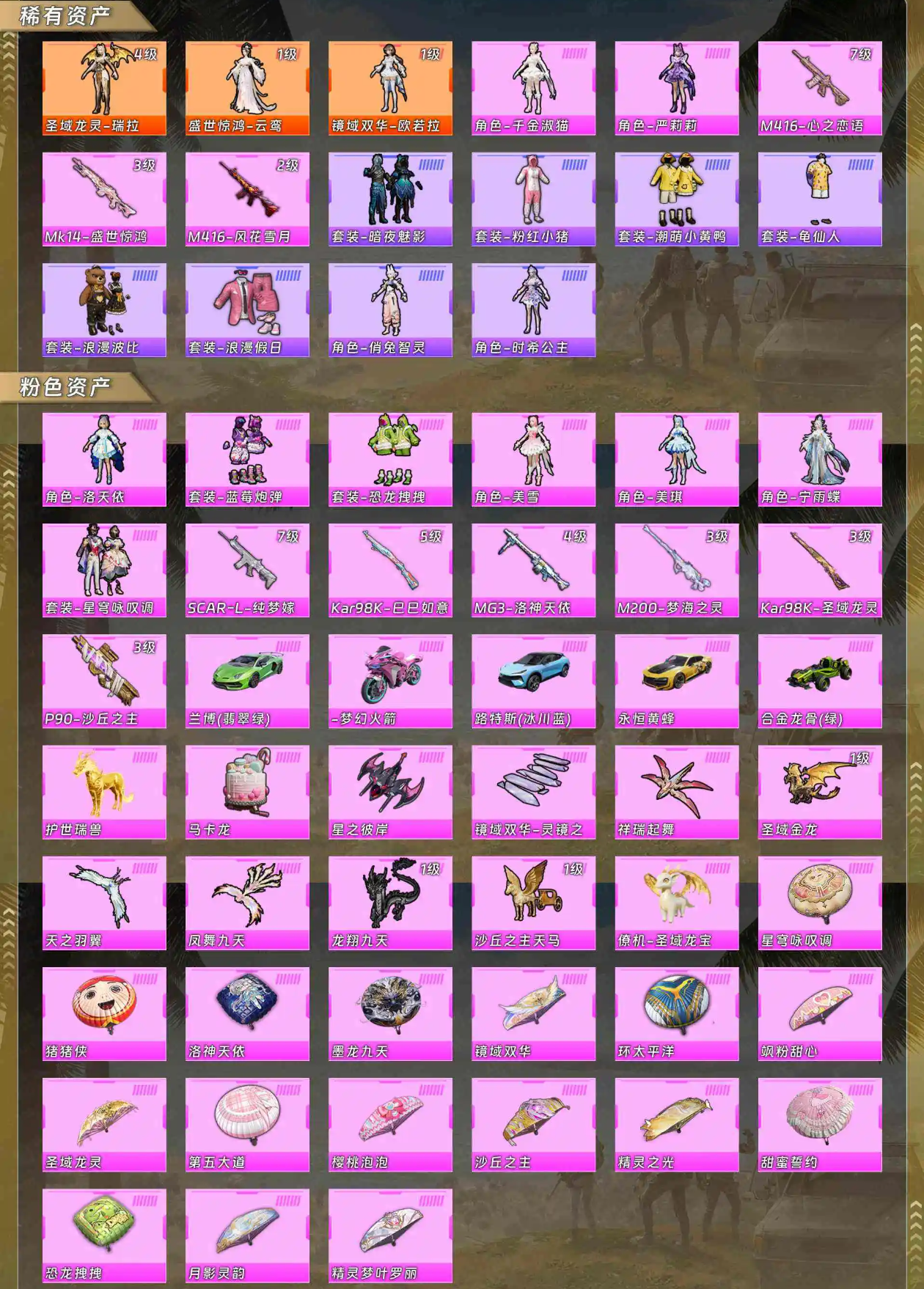 【稀有资产】圣域龙灵-瑞拉[4级]/盛世惊鸿-云鸾[1级]/镜域双华-欧若拉[1级]/角色-千金淑猫/角色-严莉莉/M416-心之恋语/Mk14-盛世惊鸿/M416-风花雪月/套装-暗夜魅影/套装-粉红小猪/套装-潮萌小黄鸭/套装-龟仙人/套装-浪漫波比/套装-浪漫假日/角色-俏兔智灵/角色-时希公主
