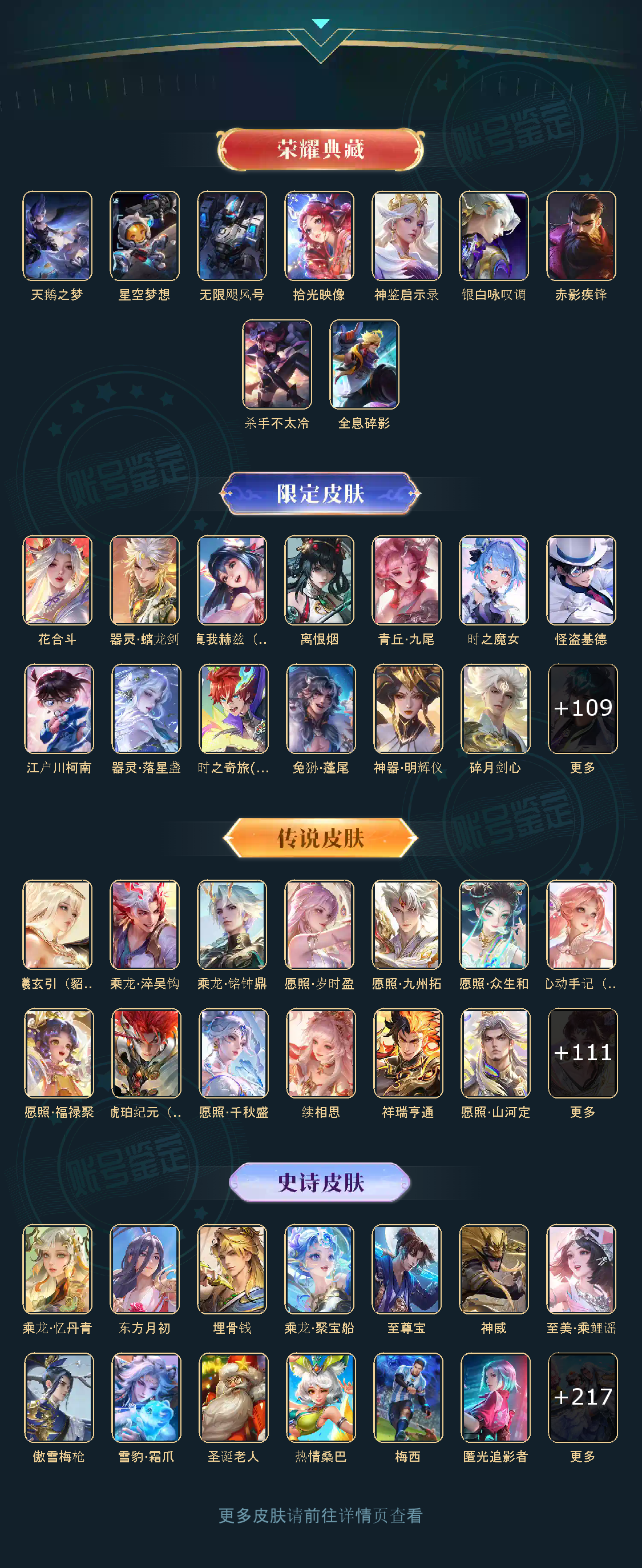 2个小兵皮营地ID72993799绝世王者【珍品传说皮肤】:兔狲·蓬尾,器灵·落星盏,时之奇旅,怪盗基德,江户川柯南【无双皮肤】:时之魔女,器灵·螭龙剑,瑶真我赫兹,雪境奇遇,神器·明辉仪,离恨烟,花合斗,青丘·九尾,碎月剑心【荣耀典藏】:全息碎影,拾光映像,神鉴启示录,银白咏叹调,赤影疾锋,星空梦想,杀手不太冷,无限飓风号,天鹅之梦【优质限定皮肤】:瑶时之祈愿,山海·琳琅生,山海·苍雷引,山海·炽霜斩,无双飞将,云中君时之祈愿,祈雪灵祝,武圣,神威,天魔缭乱,凤求凰,白虎志,梅西,至尊宝【传说皮肤】:神树通天,续相思,小动物乐团,惊梅引,星之鸣奏,千劫归真,幻光神枪,愿照·千秋盛,愿照·岁时盈,愿照·众生和,愿照·福禄聚,愿照·山河定,愿照·九州拓,祥瑞亨通,玄雷天君,映山客,鸣野蒿,牧神诗旅,霜北刀,碎云,启示之音,冥王哈迪斯,无尽星芒,花朝如约,心动手记,群星魔术团,前尘镜,黄金天蝎座,战鼓燎原,金乌负日,落雪白狼,琥珀纪元,曦玄引,曦玄引,乘龙·淬吴钩,乘龙·铭钟鼎,乘龙·问璇玑,琥珀纪元,逐花归海,觅芳踪,霜月吟,夜礼服假面,永恒水手月亮,至美·化雀舞,时之奇旅,时之奇旅,影龙天霄,遇见神鼓,鹤归松栖,妄想奇谈,妄想实况,灼幽烈阳,鹤羽星尊,电玩·雷克斯,瑶时之祈愿,追逃游戏,追逃游戏,记忆之芯,百相守梦,浮生妄,画中仙,燃星之曲,无限倾心,无限倾心,炽翼辉光,齐天大圣,山海·琳琅生,山海·苍雷引,山海·炽霜斩,怒海麟威,诗剑行,音你闪耀,神器·狴犴令,末日机甲,绯月行,星穹之声,枫霜尽,深海之息,无双飞将,挚爱之约,武陵仙君,补天,寅虎·赤拳,寅虎·瑞焰,异界灵契,乞巧织情,遇见胡旋,淬星耀世,游龙清影,李逍遥 ,音你心动,音你心动,飞鸢探春,仲夏夜之梦,默契交锋,时雨天司,祈雪灵祝,绛天战甲,炽阳神光,启明星使,零号·赤焰,冠军飞将,时之恋人,云鹰飞将,一念神魔,武圣,胖达荣荣,久胜战神,天魔缭乱,太华,永曜之星,凤求凰,猫影幻舞,黄金白羊座,黄金狮子座,地狱之眼,海洋之心,云霓雀翎,末日机甲,白虎志,黄金射手座,超时空战士,地狱火