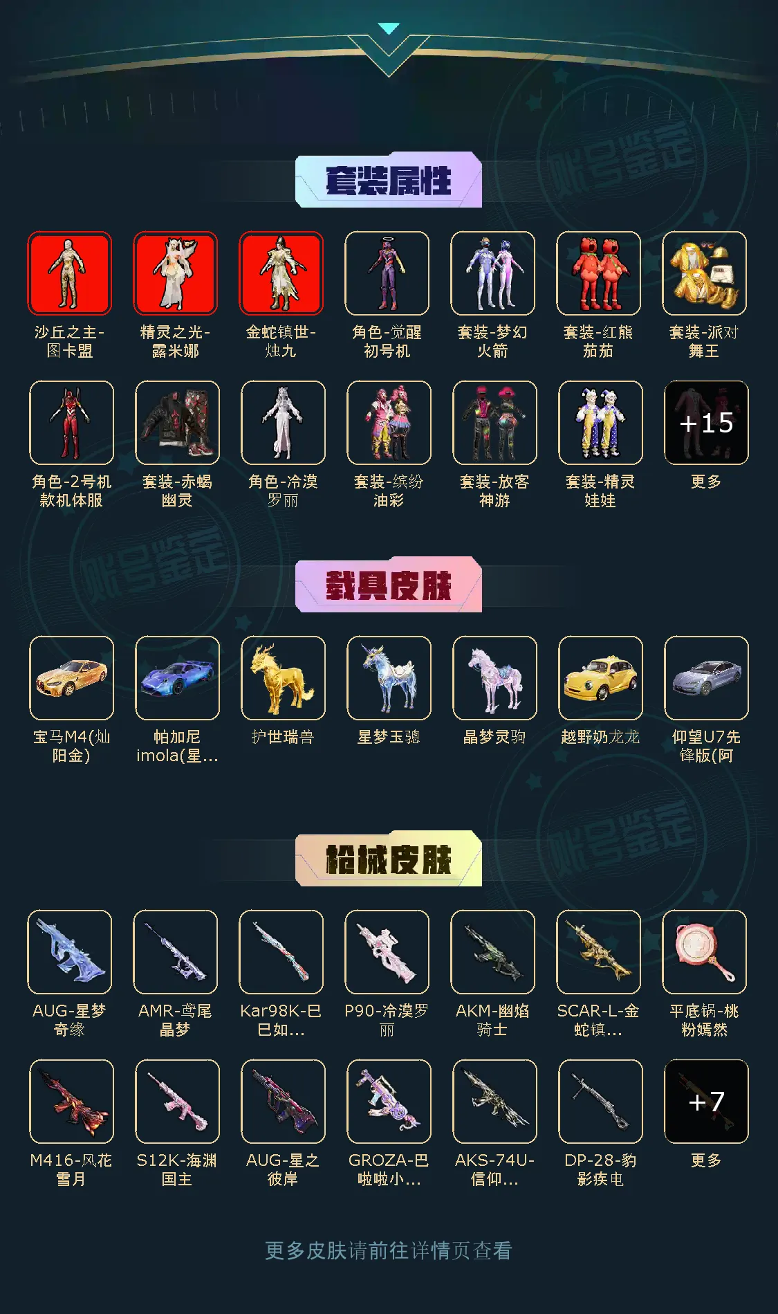 【稀有资产】沙丘之主-图卡盟[4级]/金蛇镇世-烛九[1级]/精灵之光-露米娜[1级]/帕加尼imola(星空蓝)[3级]/宝马M4(灿阳金)[3级]/角色-2号机款机体服/套装-第五大道/套装-缤纷油彩/M416-风花雪月/破片手榴弹-粉粉猫爪/AUG-星梦奇缘/AUG-星之彼岸/烟雾弹-丁香清露/AKM-幽焰骑士/M416-墨龙九天/SCAR-L-金蛇镇世/GROZA-精灵之光/破片手榴弹-热量炸弹/角色-Mark.06/角色-零款战斗服/角色-真理款战斗服/角色-薰款战斗服/角色-真嗣款战斗服/巡查员上衣/小恶魔头饰/套装-派对舞王/套装-深海小丑鱼/套装-赤蝎幽灵/套装-奇异狩猎者/套装-胖达圆圆/套装-粉红小猪/套装-潮萌小黄鸭/套装-雪山精英/套装-暗影哥特/套装-浪漫波比/套装-晶辉守护/套装-软软马卡龙/套装-红熊茄茄/套装-净心行者/套装-纯白跃动/套装-动感兔斯基人偶服/套装-狂沙舞者/套装-牛仔情诗/套装-圣穹绘梦/套装-冷酷挑战者/角色-粉雾星云/角色-摩登魅猫/角色-2B战斗服款/角色-俏兔智灵/角色-灵公主/角色-时希公主/角色-乐音/角色-银尘/角色-冰公主/套装-暗夜风云/角色-军刀雅典娜/套装-暗夜行者