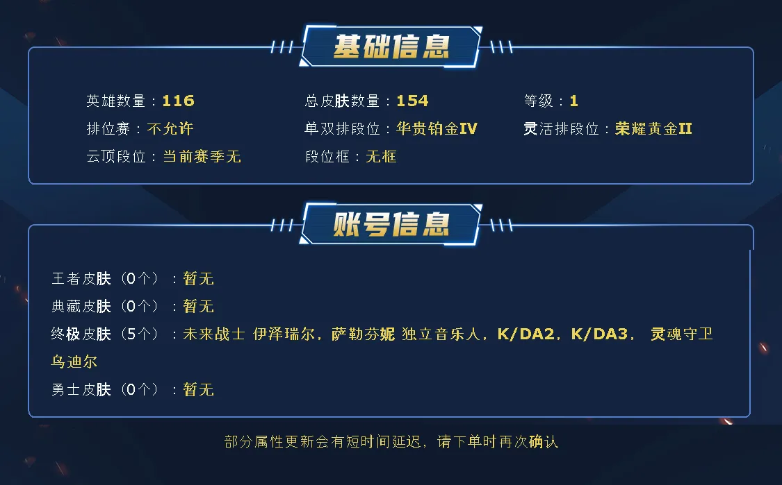 温馨提示:此账号为快速.上号模式登录,不需要输入账号密码,租用后- -键登录即可,如果出现登录异常等无法登录情况,只需要先打开游戏到登录界面,然后在用租号玩一键登录即可。 安全提示:使用外挂恶意刷分、撤单或者恶意投诉差评大将永久拉黑处理,请文明游戏 小子在这祝您游戏愉快,喜欢的点击收藏▼记得给小子个五星好评呦▼