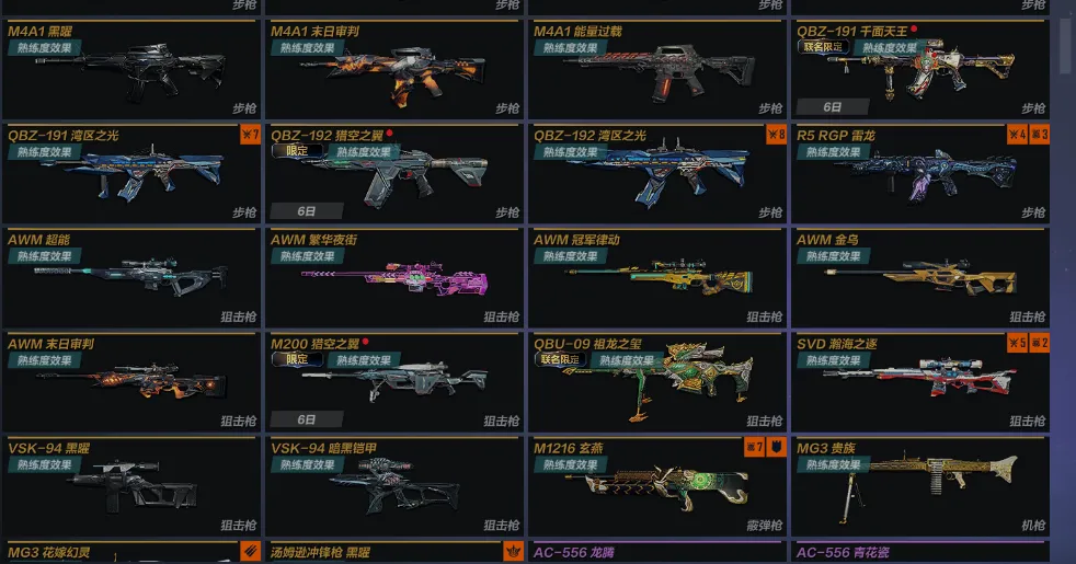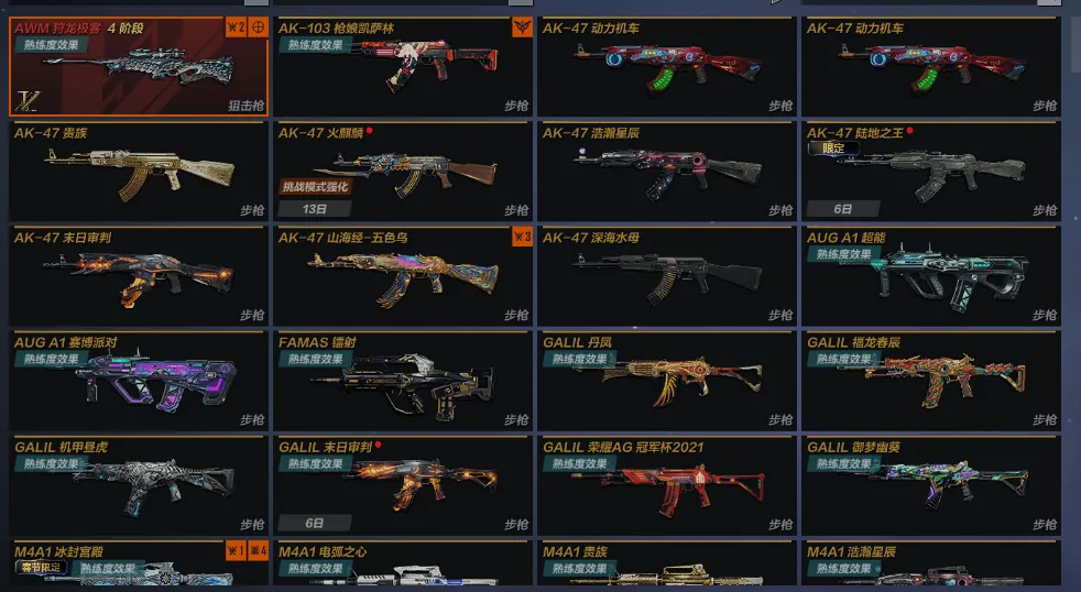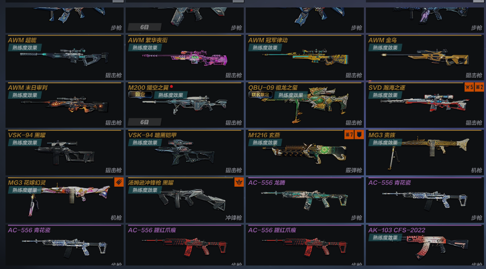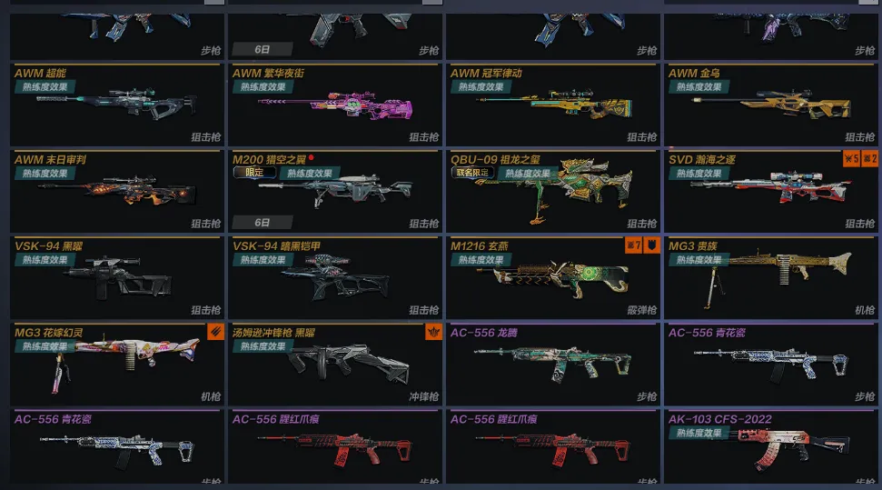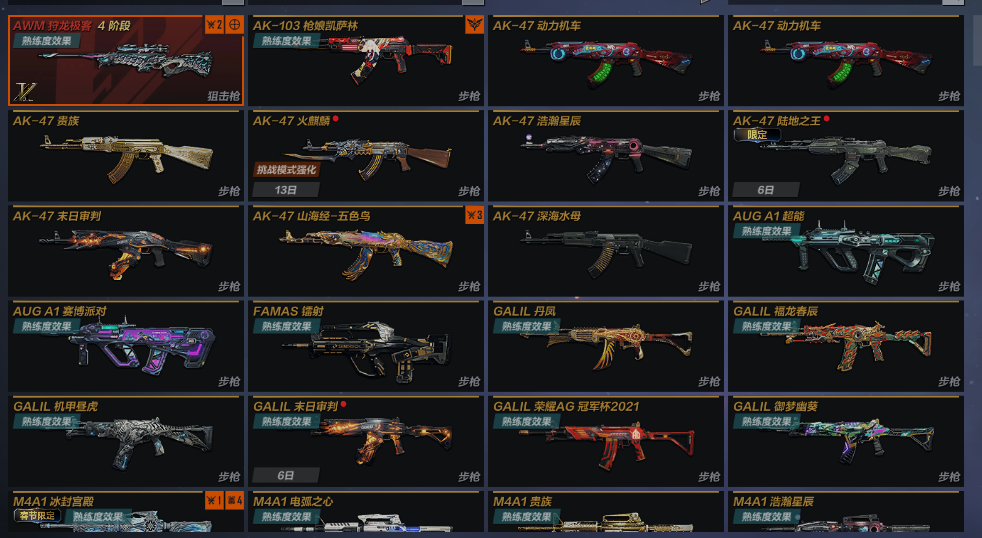 主武:AWM狩龙极客4阶段 AK103枪娘凯萨林 AK47动力机车X2 AK47贵族 AK47浩瀚星辰 AK47末日审判 AK47山海经五色鸟 AK47深海水母 AUGA1超能 AUGA1赛博派对 FAMAS镭射 GALIL丹凤 GALIL福龙春辰 GALIL机甲昼虎 GALIL荣耀AG冠军杯2021 GALIL御梦幽葵 M4A1冰封宫殿 M4A1电弧之心 M4A1贵族 M4A1浩瀚星辰 M4A1黑曜 M4A1末日审判 M4A1能量过载 QBZ191湾区之光X2 R5RGP雷龙 AWM超能 AWM繁华夜街 AWM冠军律动 AWM金乌 AWM末日审判 QBU09祖龙之玺 SVD瀚海之逐 VSK94黑曜 VSK94暗黑铠甲 M1216玄燕 MG3贵族 MG3花嫁幻灵 汤姆逊冲锋枪黑曜