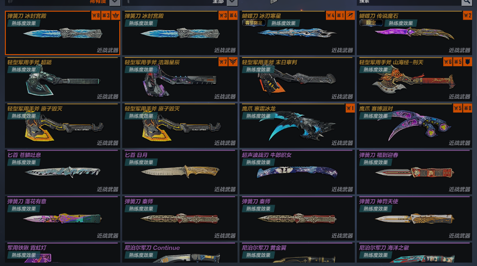 近战: 弹簧刀冰封宫殿X2 蝴蝶刀冰刃寒星 蝴蝶刀传说魔石 轻型军用手斧超能 轻型军用手斧浩瀚星辰 轻型军用手斧末日审判 轻型军用手斧山海经刑天 轻型军用手斧原子毁灭X2 鹰爪寒霜冰龙 鹰爪赛博派对