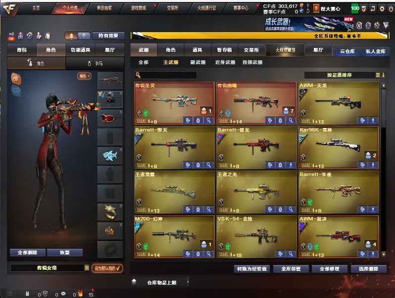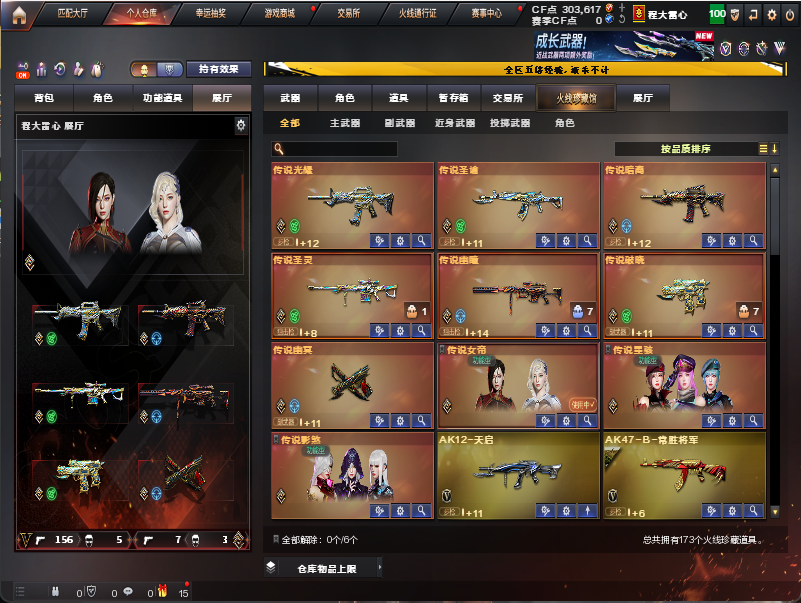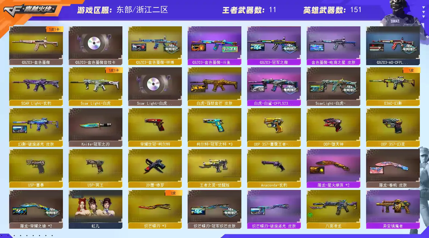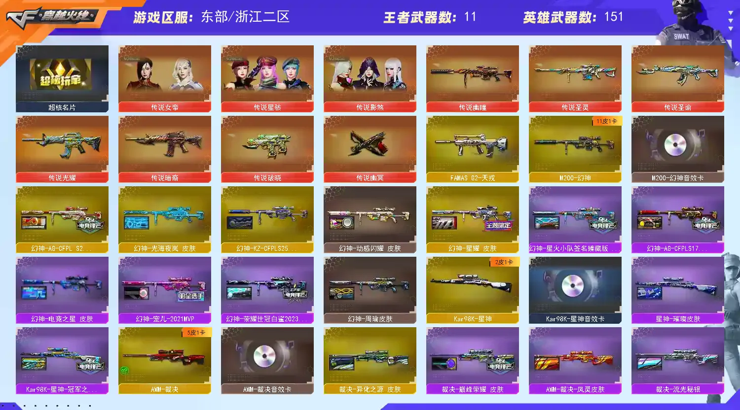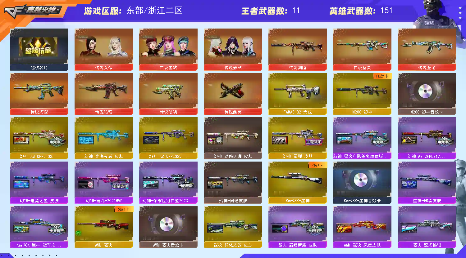 爆破:幻神光海kz星火宠儿AG周瑜等11皮+3冠特+usp雷暴+usp冥王+cop王者雷霆(觉醒版)+cop幻灵堕天神+荣耀世冠柯尔特。白虎(冠军之虎+BS皮+百战皮+音效卡)QBZ(冠军+ag+拼搏+斗鱼+音效卡)裁决(巅峰+异变+流光+音效卡)星神(冠军+璀璨+音效卡)天罚带卡+G36c带皮+3蝴蝶刀(带皮)等等。传说:传说女帝+传说星骇+传说影煞(三传说四防)+传说光耀+传说暗裔+传说幽瞳+传说幽冥+传说破晓+传说圣谕+传说圣灵。生化:蓝色泡泡象+6盘6烈+2蝴蝶+2清道夫+八面满级+炼狱秦师+天戎等。雷神带音效卡带冠军带最新超核皮肤