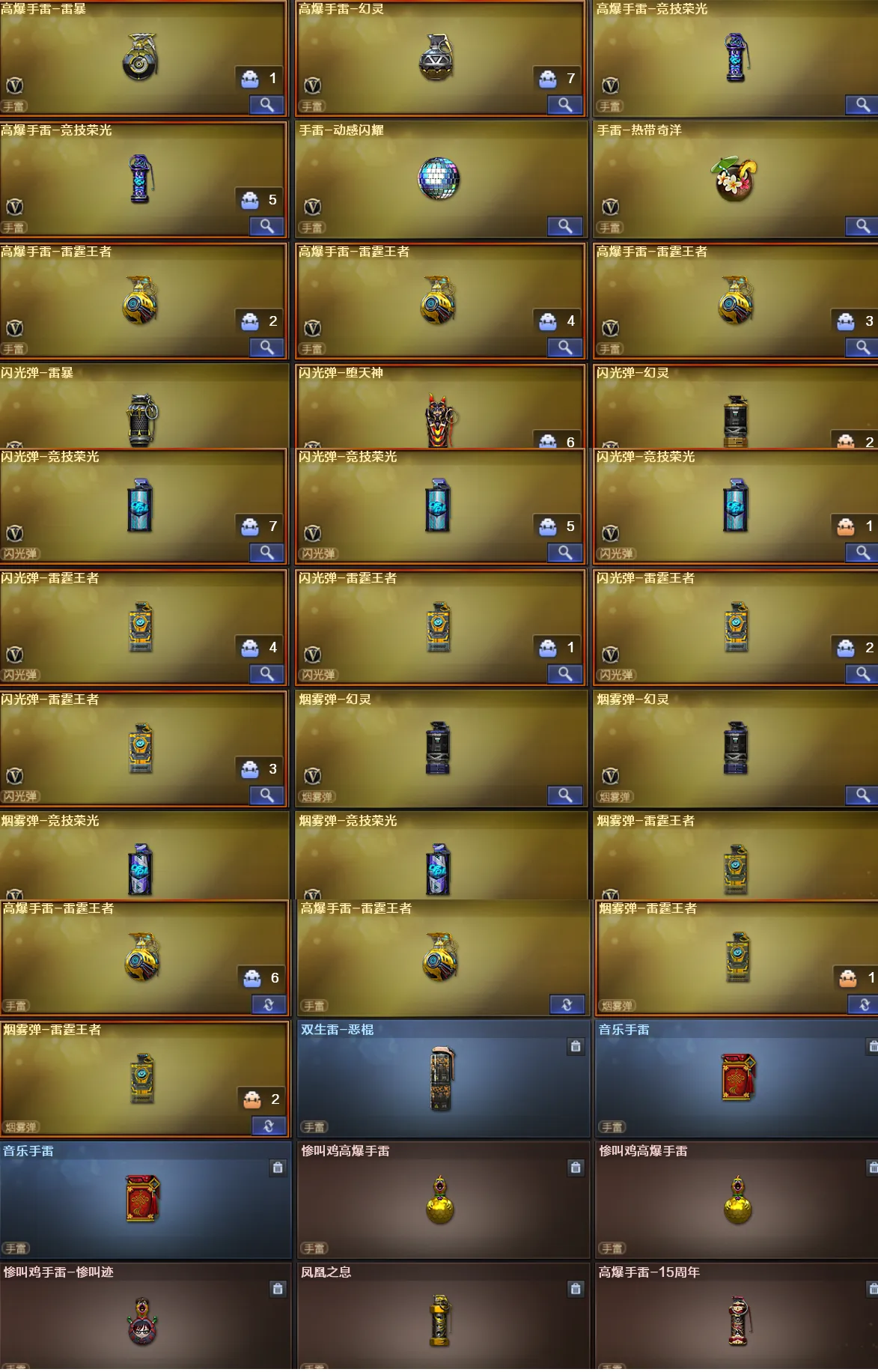 投掷武器及套装:雷暴套、幻灵套、竞技荣光套X2、音乐手雷X2、迷你生化手雷、凤凰