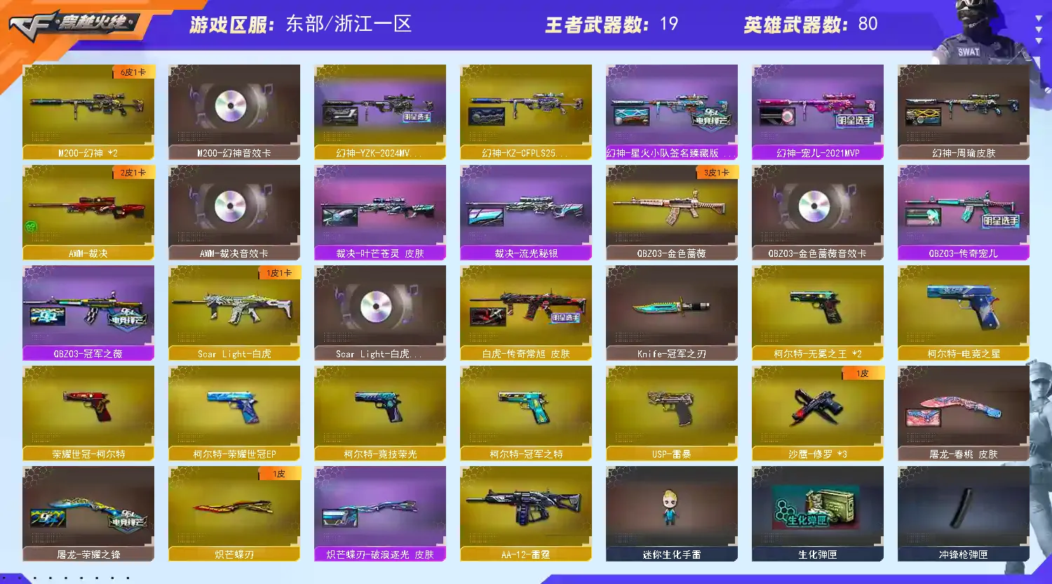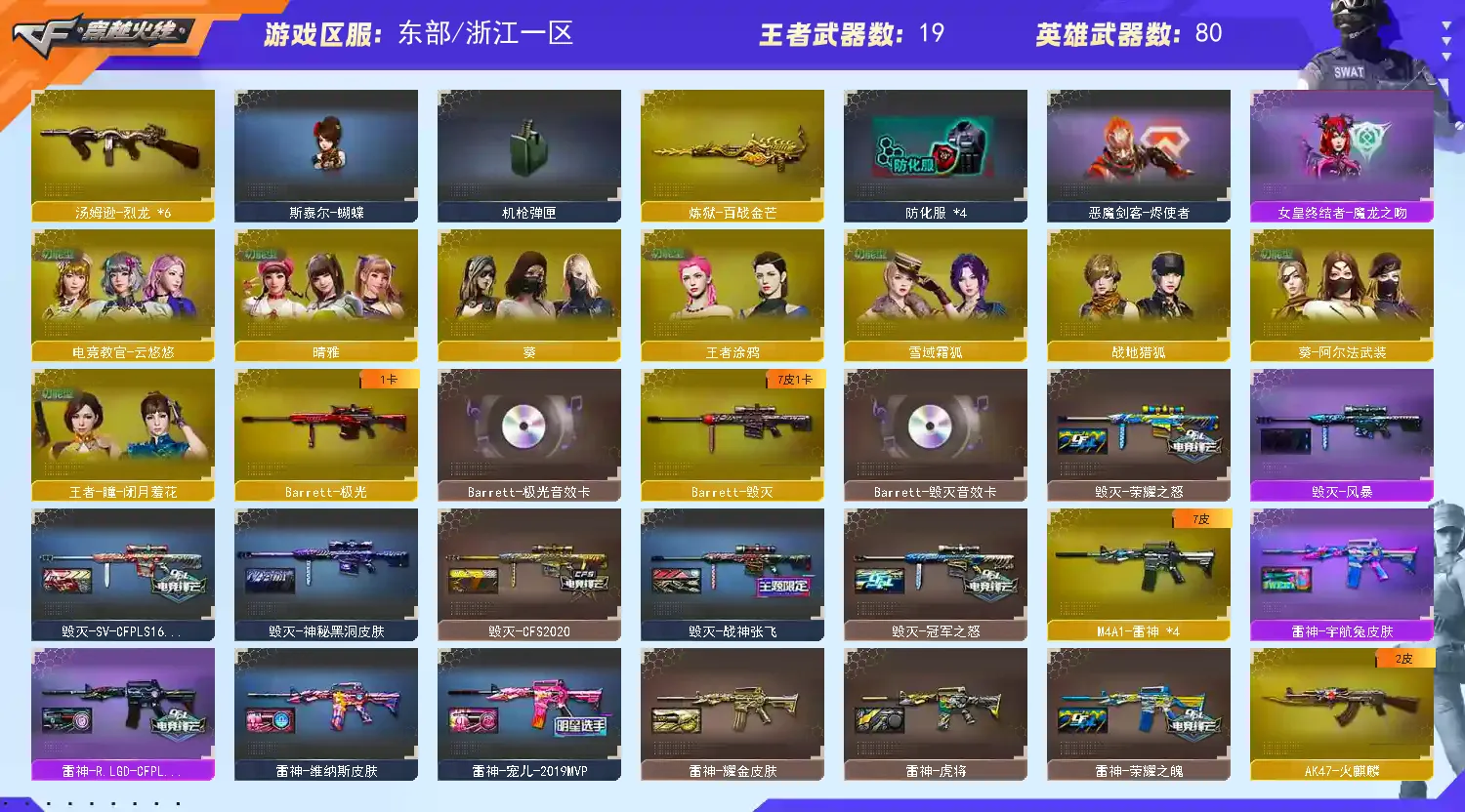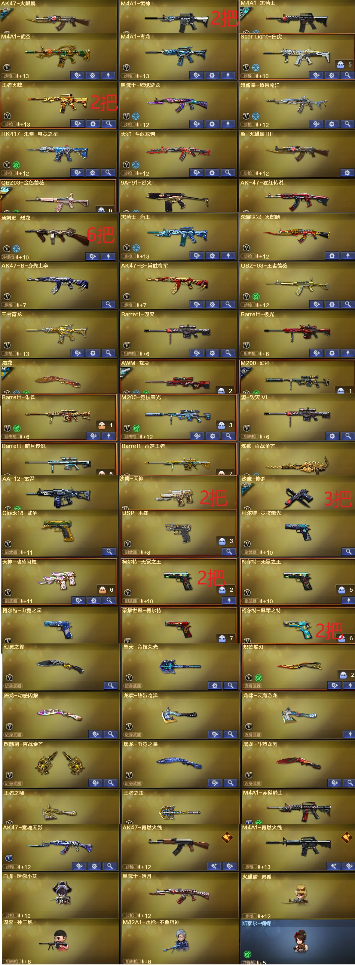 稀有武器:M200幻神X2、M200竞技荣光、烈龙X6+斯泰尔蝴蝶、火麒麟、雷神X2、黑骑士、M4A1武圣、M4A1青龙、SCAR白虎、黑武士锦绣游龙、超新星热带奇洋、HK417朱雀电竞之星、天罚斗烈龙驹、源火麒麟、QBZ金色蔷薇、烈火、毁灭、极光、裁决、Barrett朱雀、源毁灭、荣耀世冠火麒麟、暗月传说、炼狱百战金芒、雷霆、修罗X3、天神X2、Glock武圣、USP雷暴、柯尔特竞技荣光、天神动感闪耀、柯尔特无冕之王X2、柯尔特电竞之星、荣耀世冠柯尔特、柯尔特冠军之特、柯尔特荣耀世冠EP、屠龙、幻灵之锋、擎天竞技荣光、炽芒蝶刃、屠龙动感闪耀、龙啸热带奇洋、龙啸云海游龙、麒麟刺百战金芒、屠龙电竞之星、屠龙斗烈龙驹、M4A1再燃战线、AK47再燃战线、Knife冠军之刃