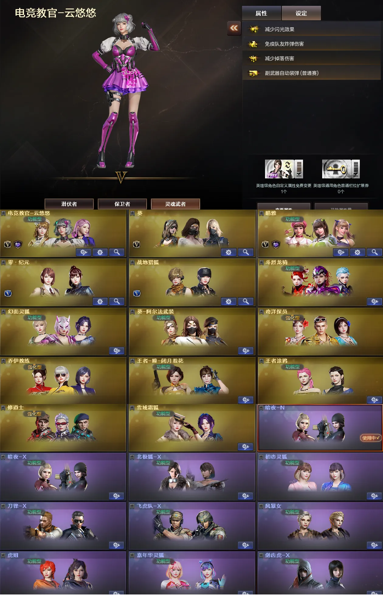 稀有角色:四防电竞教官云悠悠(减少掉落伤害/减少闪光效果/免疫队友炸弹伤害/副武器自动装弹)、葵、晴雅、零纪元、战地猎狐、斗烈龙骑、幻面灵狐、葵阿尔法武装、奇洋探员、乔伊教练、王者瞳闭月羞花、王者涂鸦、修道士、雪域霜狐、暗夜X、灵狐者黄金海岸