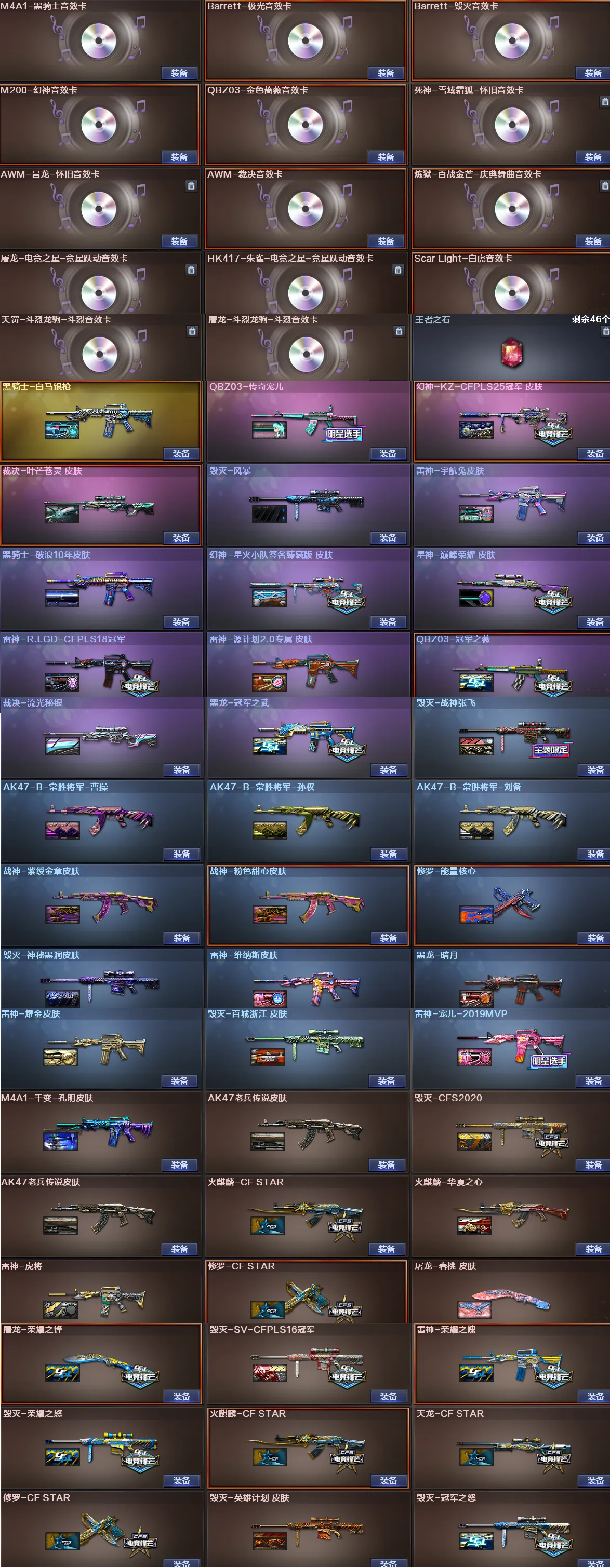 音效卡:M200幻神音效卡、黑骑士音效卡、极光音效卡、毁灭音效卡、QBZ金色蔷薇音效卡、裁决音效卡、炼狱百战金芒庆典舞曲音效卡、HK417朱雀电竞之星竟星悦动音效卡、白虎音效卡、屠龙电竞之星竟星悦动音效卡、屠龙斗烈龙驹音效卡、天罚斗烈龙驹音效卡