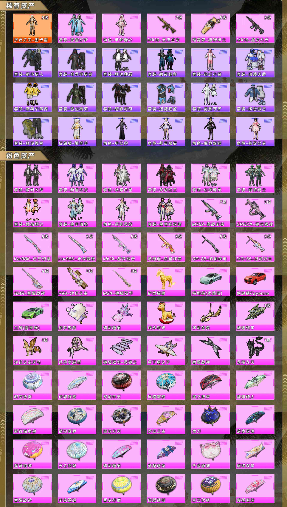 【稀有资产】沙丘之主-图卡盟[3级]/套装-雪国幻梦/角色-羊梦糖心/M416-五爪金龙/烟雾弹-猫咪绅士/M416-墨龙九天/套装-都市猎人/套装-奇异狩猎者/套装-胖达圆圆/套装-暗夜魅影/套装-粉红小猪/套装-浪漫天命/套装-潮萌小黄鸭/套装-雪山精英/套装-暗影哥特/套装-迅捷狂鲨/套装-晶辉守护/套装-缤纷假日/套装-狂沙舞者/玩偶服-懒羊羊/角色-申公豹/角色-都市丽猫/角色-摩登魅猫/角色-临安公主