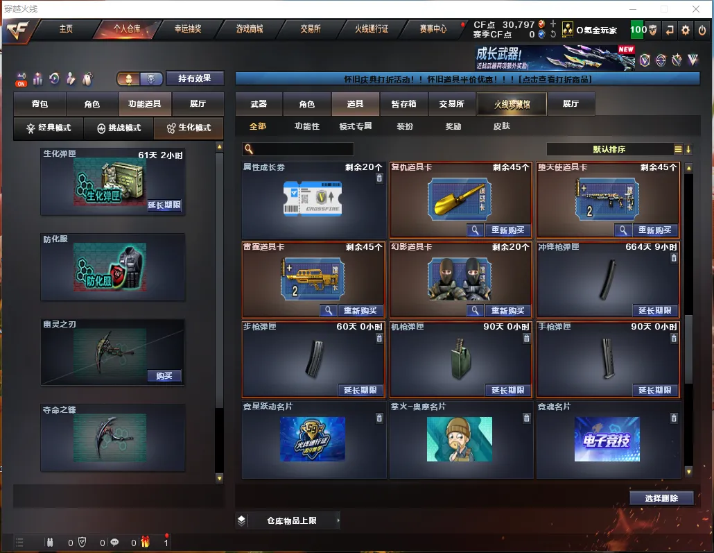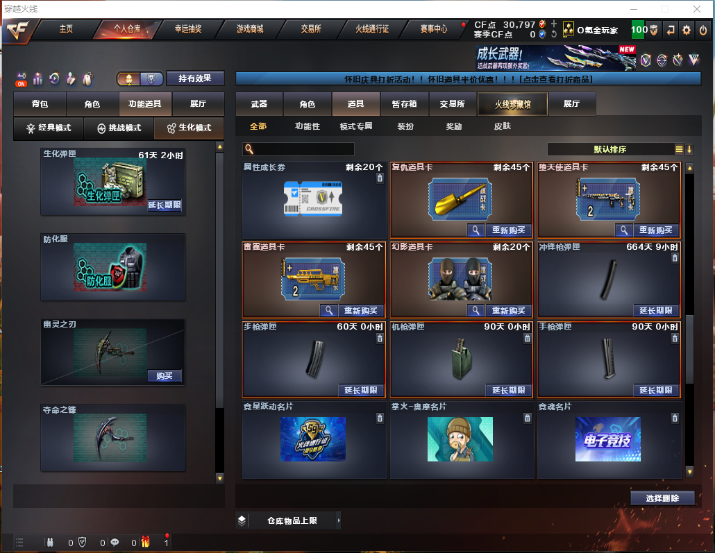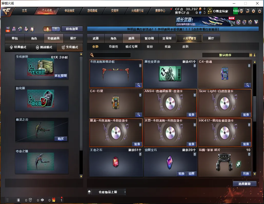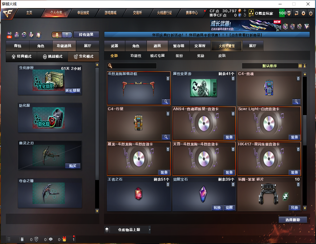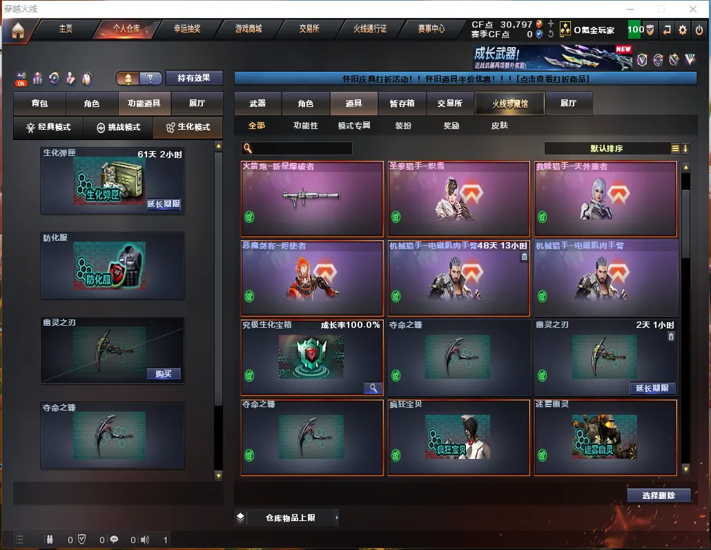 【道具】元首/全背包/VIP/变异宝贝/灵魂忍者/绿巨人/疯狂宝贝/迷雾幽灵/冲锋枪/手枪/机枪/生化弹夹/圣泉猎手-炽雪皮肤/剑客皮肤/救赎猎手-天外旅者皮肤/机械猎手-电磁臂皮肤/火箭筒新星爆破者皮肤/生化爆破全装