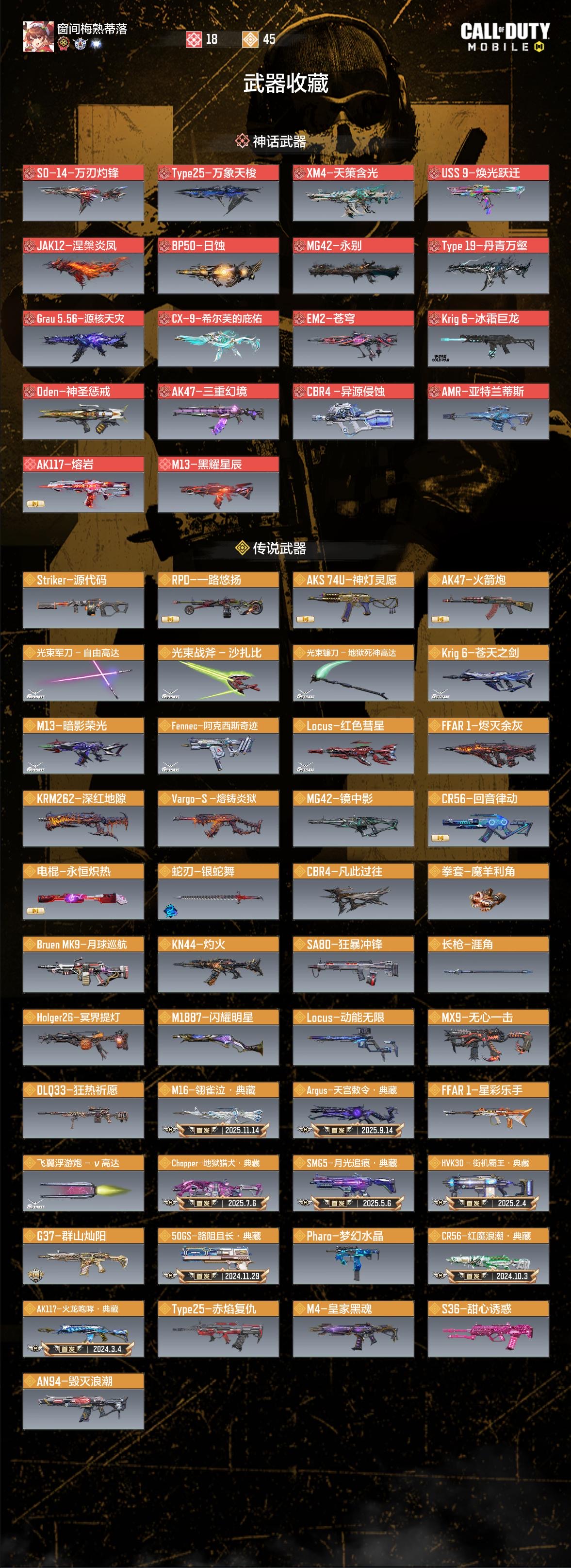 Striker—源代码、RPO—一路悠扬、AKS 74U—神灯灵感、AK47—火箭炮、光束军刀—自由高达、光束战斧—沙扎比、光束镰刀—地狱死神高达、Krig 6—苍天之剑、M13—暗影荣光、Fennec—阿克西斯奇迹、Locus—红色彗星、FFAR 1—烬灭余灰、KRM262—深红地隙、Vargo-S—熔铸炎狱、MG42—镜中影、CR56—回音律动、电棍—永恒炽热、蛇刃—银蛇舞、CBR4—凡此过往、拳套—魔羊利角、Bruen MK9—月球巡航、KN44—灼火、SABO—狂暴冲锋、长枪—涯角、Holger26—冥界提灯、M1887—闪耀明星、Locus—动能无限、MX9—无心一击、DLQ33—狂热祈愿、M16—翎雀泣·典藏、Argus—天宫敕令·典藏、FFAR 1—星彩乐手、飞翼浮游炮—v高达、Chopper—地狱猎犬·典藏、SMG5—月光追痕·典藏、HVK30—街机霸王·典藏、G37—群山灿阳、50GS—路阻且长·典藏、Pharo—梦幻水晶、CR56—红魔浪潮·典藏、AK117—火龙咆哮·典藏、Type25—赤焰复仇、M4—皇家黑魂、S36—甜心诱惑、AN94—毁灭浪潮