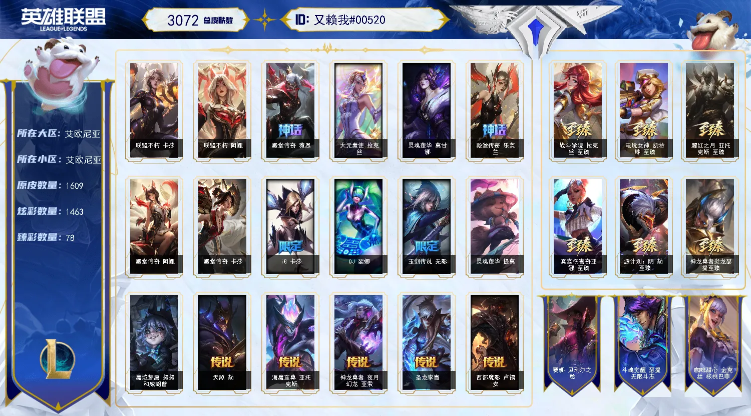 3400皮双签名圣堂莫甘娜♥️神话幻想沉溺暗影金鱼枫姬♥️龙马烈焰愚人节♥️云顶至臻小小龙瞎