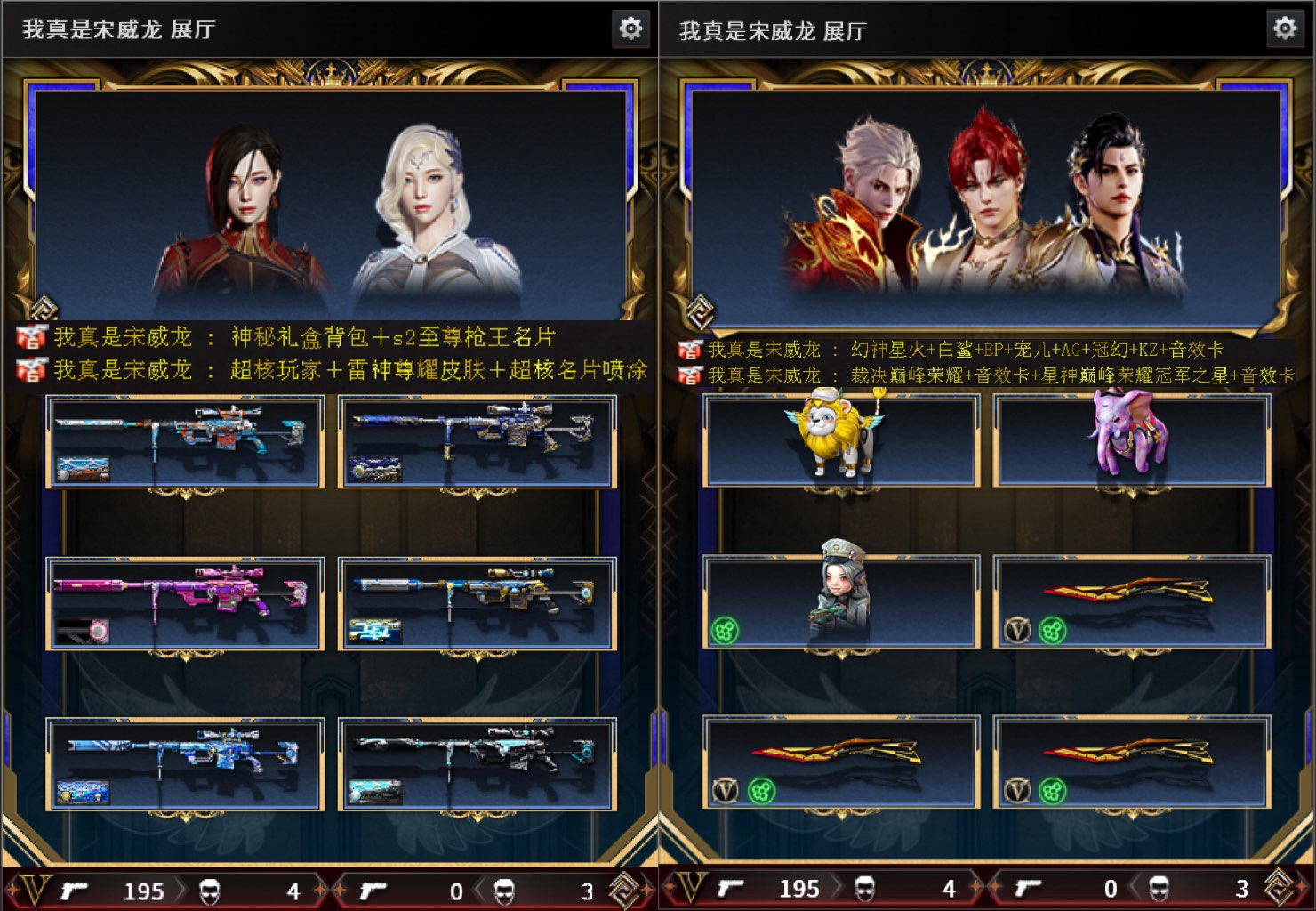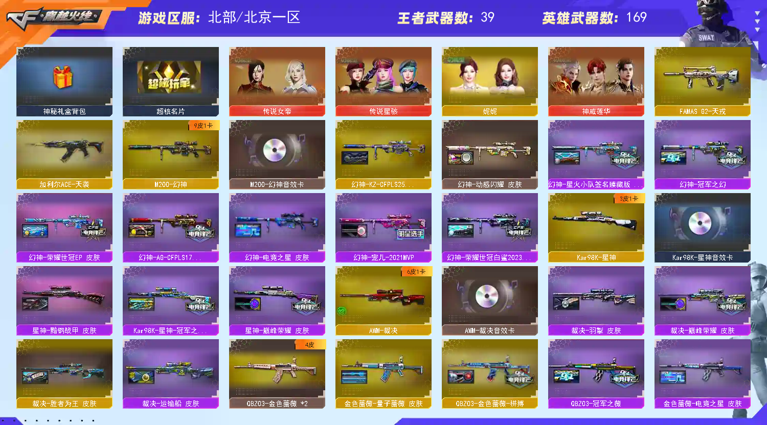 神秘礼盒背包+超核玩家+*全网稀有超核至尊雷神尊耀皮及名片,传说星骇传说女帝传说神威莲华都开4防,四防妮妮四防宋雨琦,3雷霆王者cop3冥王usp1冠军之特1荣耀世冠白鲨柯尔特1柯尔特无冕之王1雷暴王者usp1冠军之刃幻神8质量皮:星火小队+荣耀世冠白鲨+荣耀世冠ep+宠儿+AG+冠军之幻+kz+电竞之星。裁决巅峰荣耀,星神冠军之星+巅峰荣耀。qbz冠军之薇,雷神拼搏超核皮肤,蝴蝶刀冠军+荣耀。
