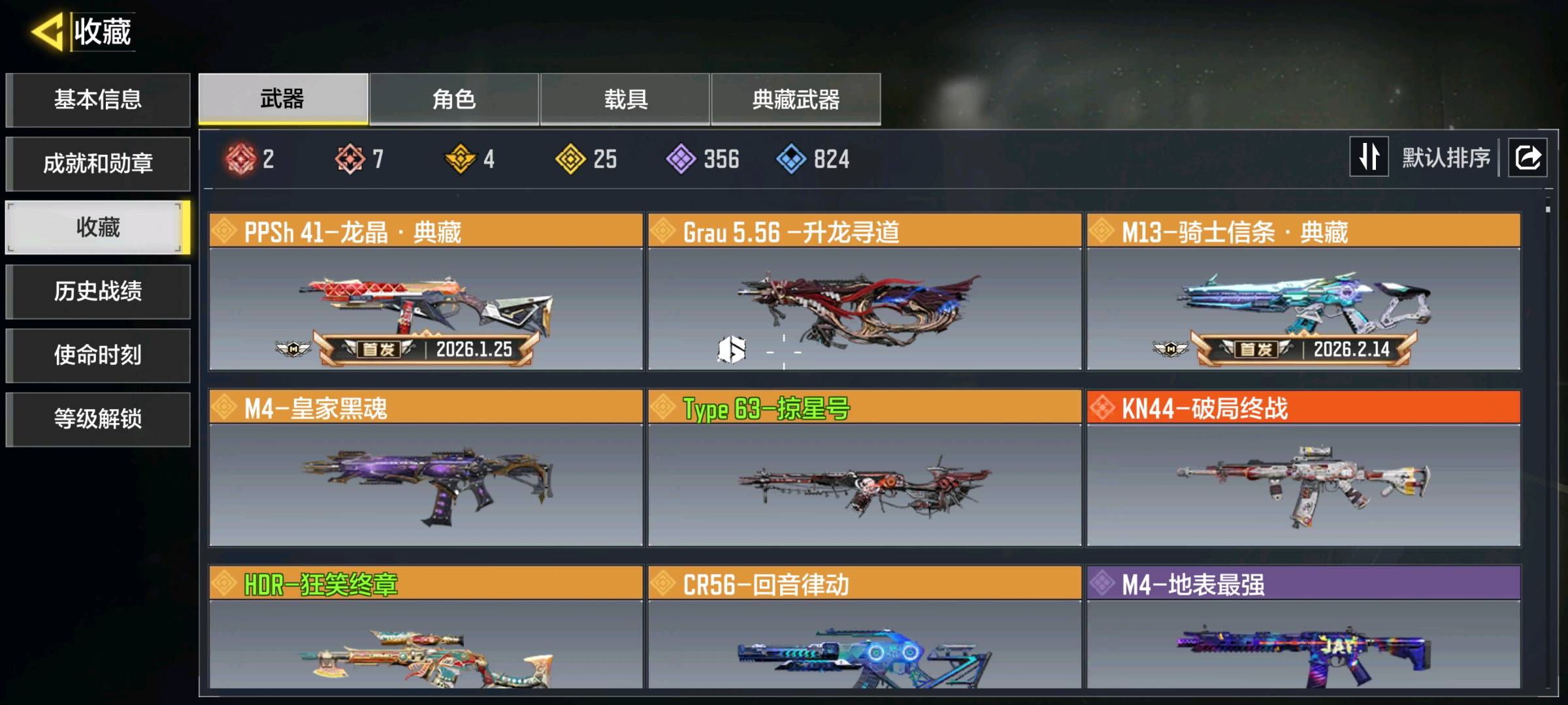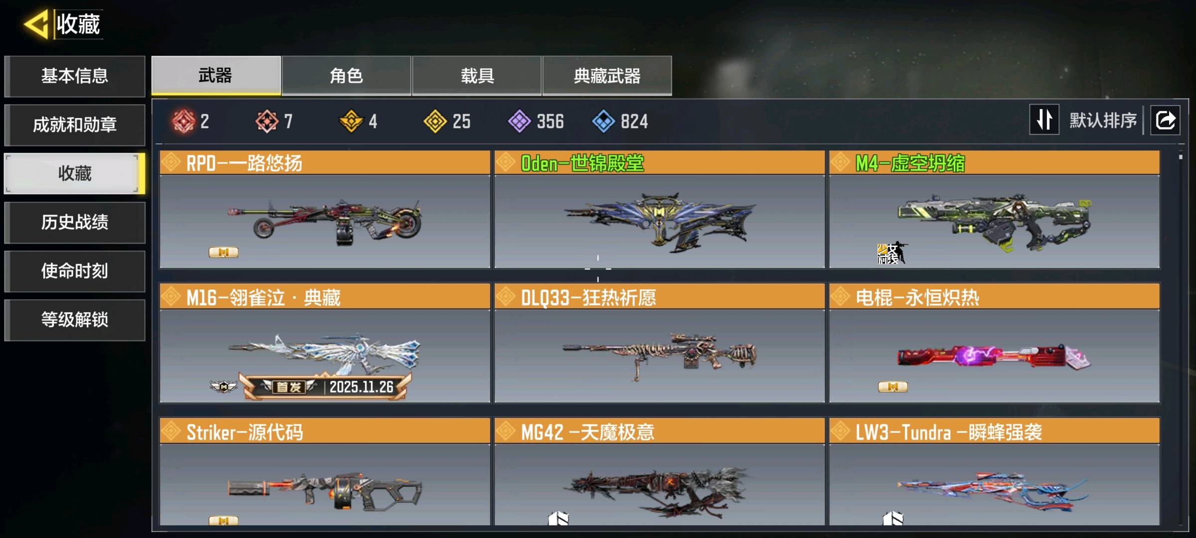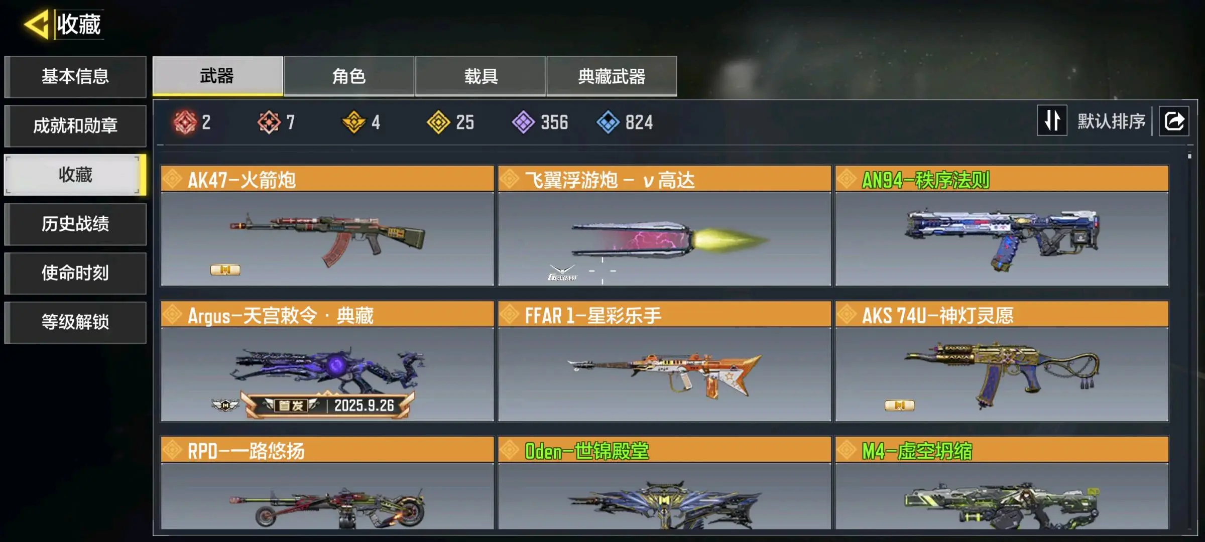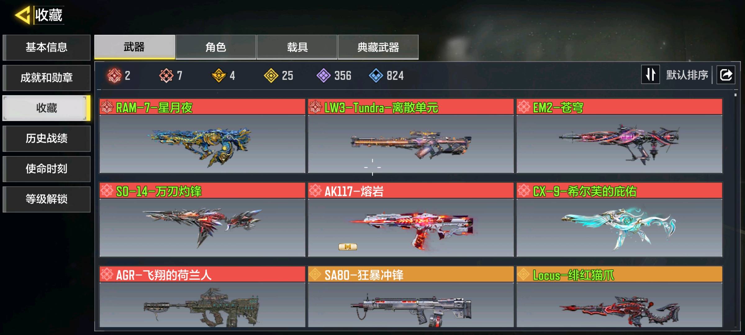 武器:ram-7星月夜(满)/lw3-离散单元(满)/cx9-希尔芙的庇佑/so-14万忍灼烽/emr-苍穹/ak117-熔岩